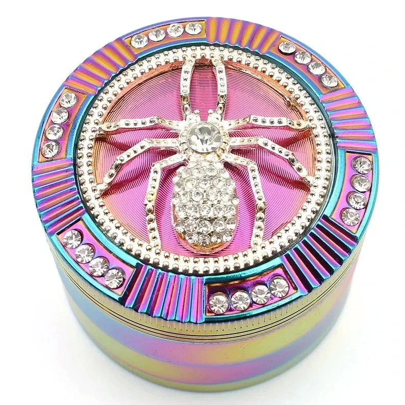 2. Rainbow 50mm Metal Herb Grinder 4 Piece – Frog, Spider & Diamond Designs with Sharp Diamond Teeth