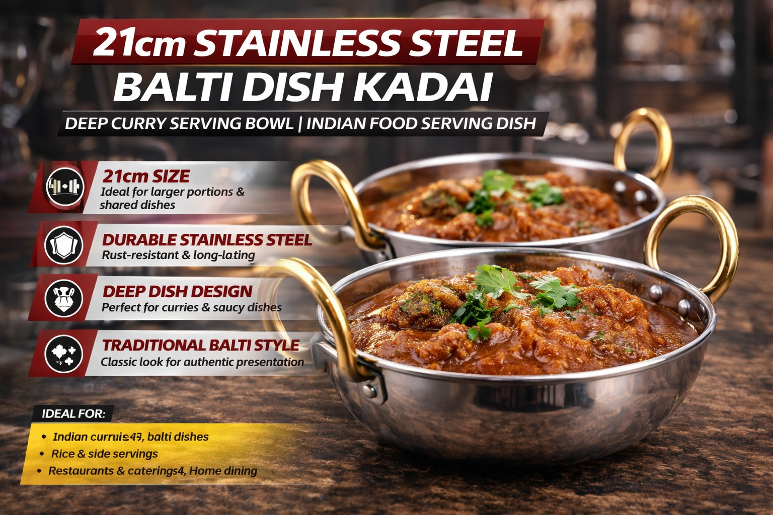 21cm Stainless Steel Balti Dish Kadai โ Deep Curry Serving Bowl | Indian Food Serving Dish