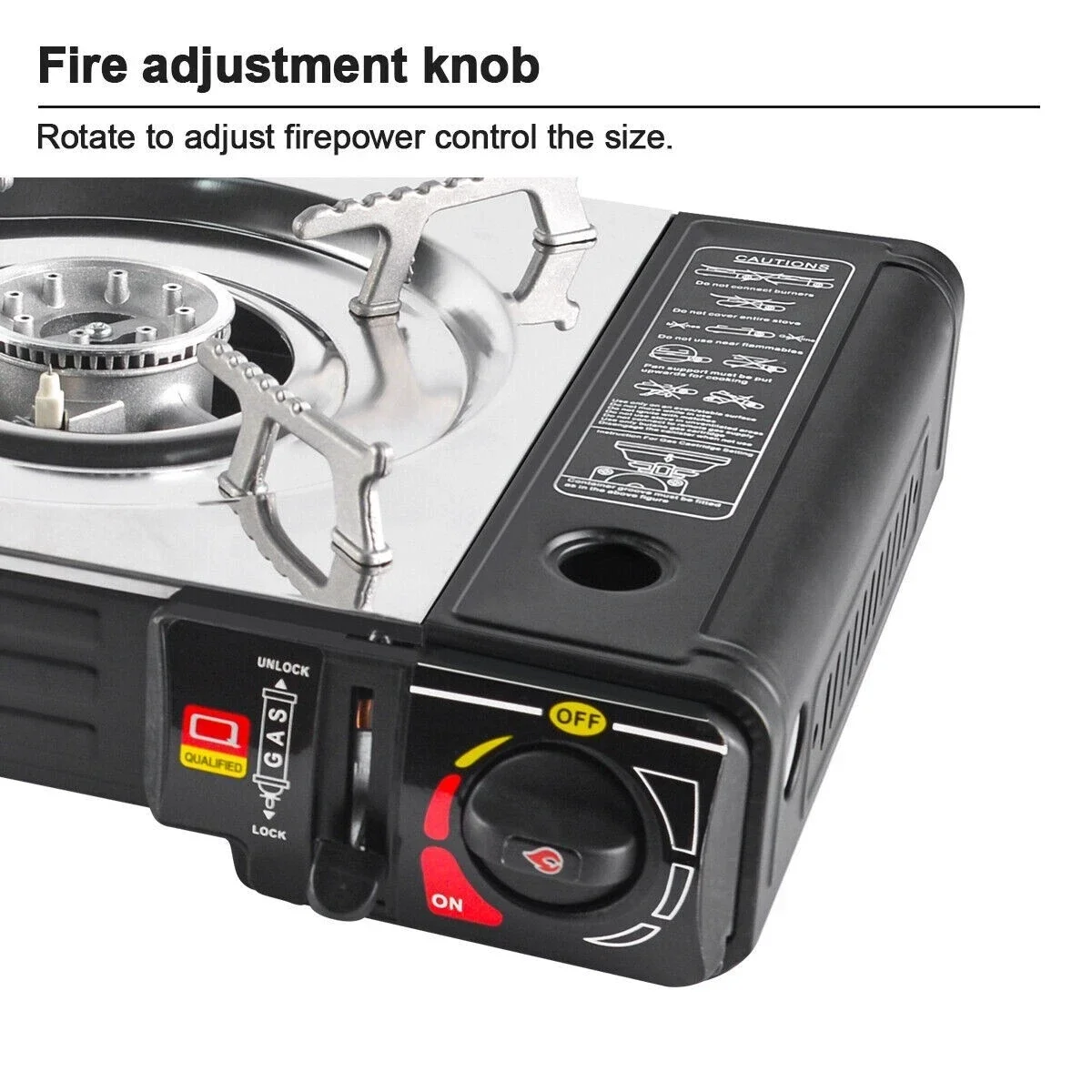 Cook anywhere with ease using this Portable Double Burner Gas Stove, perfect for camping, outdoor adventures, and home backup use. Designed for convenience and performance, this butane cooker features two burners for efficient cooking, allowing you to prepare multiple dishes at once.