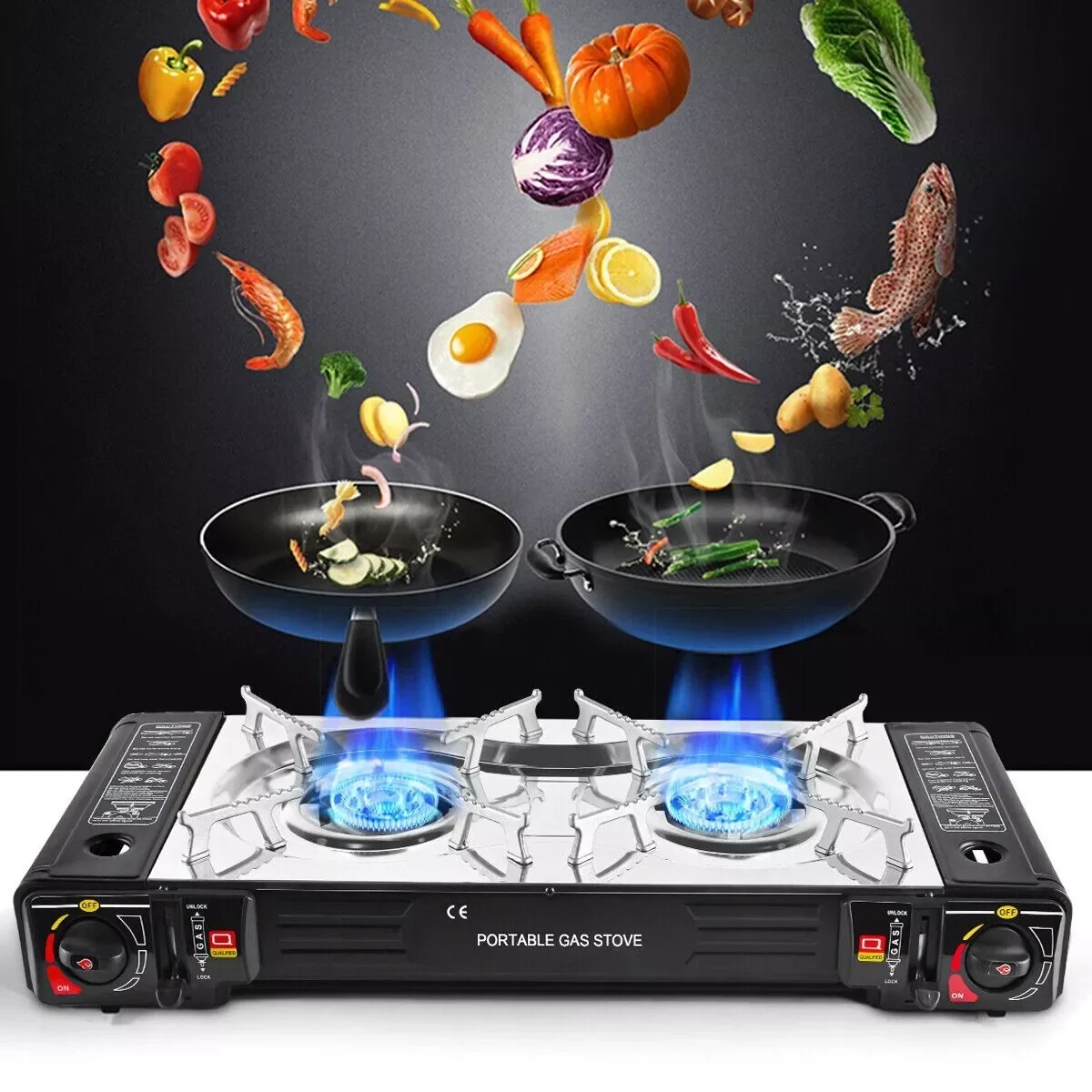 Portable Double Burner Gas Stove – Camping Butane Cooker BBQ Stove for Outdoor Cooking